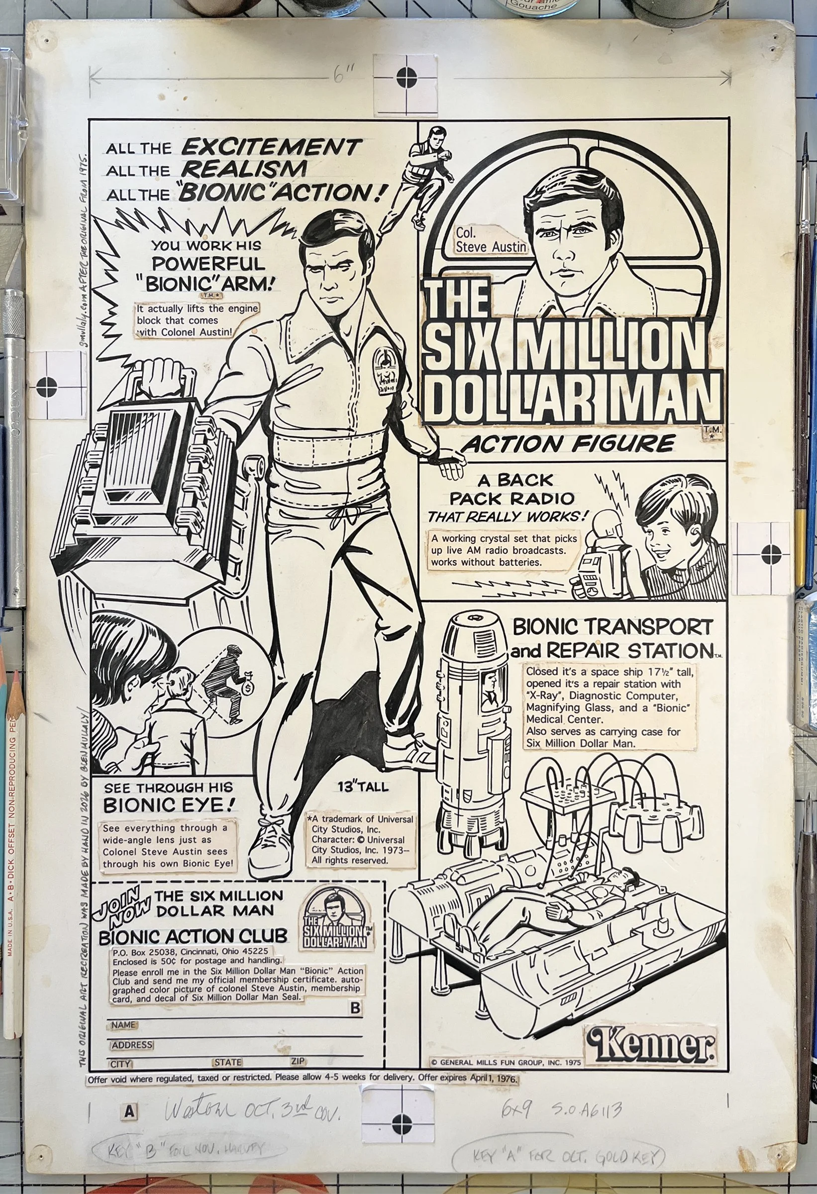 Created by hand with methods as close as possible to how the original was made including using vintage supplies and tools whenever available. Aged board and reproduction stats with rubber cement staining, white out, blue-line guides for screen tones, and other production marks.