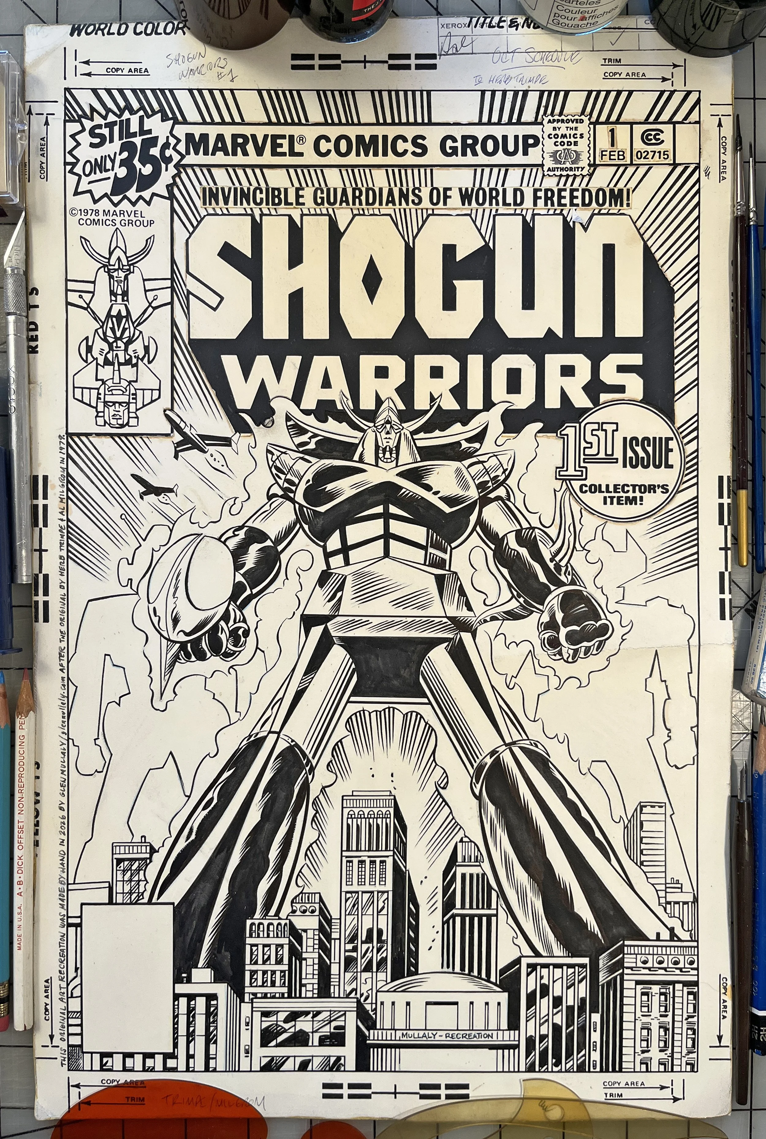 This recreation is an homage to Herb Trimpe (pencils) and Al Milgrom’s (inks) classic first cover for Marvel’s adaption of the Mattel Toys hit Japanese toy-based Shogun Warriors line from 1978. Roughly 12" x 18" on 2 ply plate finish Bristol board. The actual original cover art was made from a “stat” of the giant robots and city scape which was reduced in size and composited with the other cover elements to produce the final cover with only a very small amount of real art on it. So it was satisfying to create this recreation that contains more actual art than the original camera-ready art did!