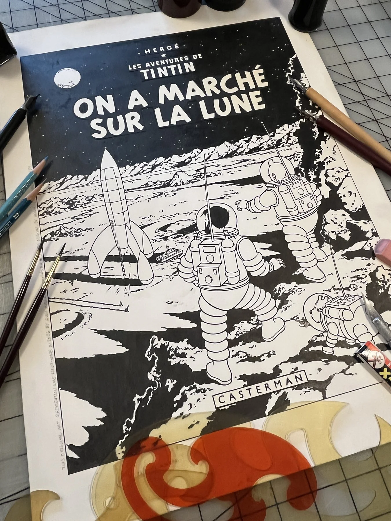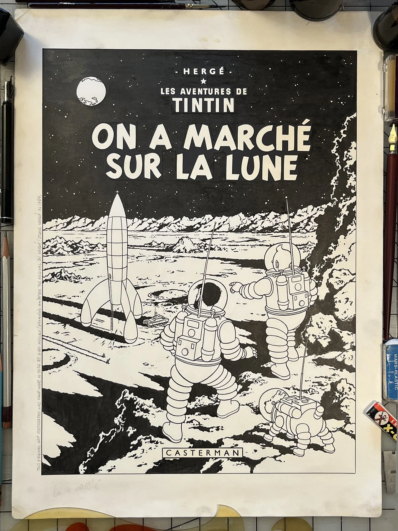I tackled one of the most iconic European comic covers with this recreation of Hergé and his studio's Tintin classic "On a Marché Sur la Lune" (Explorers on the Moon) from 1954. I based my version on the original Casterman's first printing cover, so there are some minor differences from later reprints.
